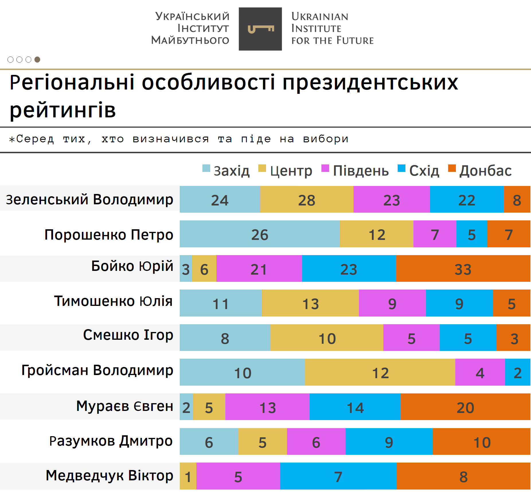 В Центре президент удерживает первое место с 19% против 9% Ю.Тимошенко, 8% П. Порошенко и 8% В.Гройсмана, а также на Юге еще опережает незначительно Ю.Бойко с 17% против 16%.