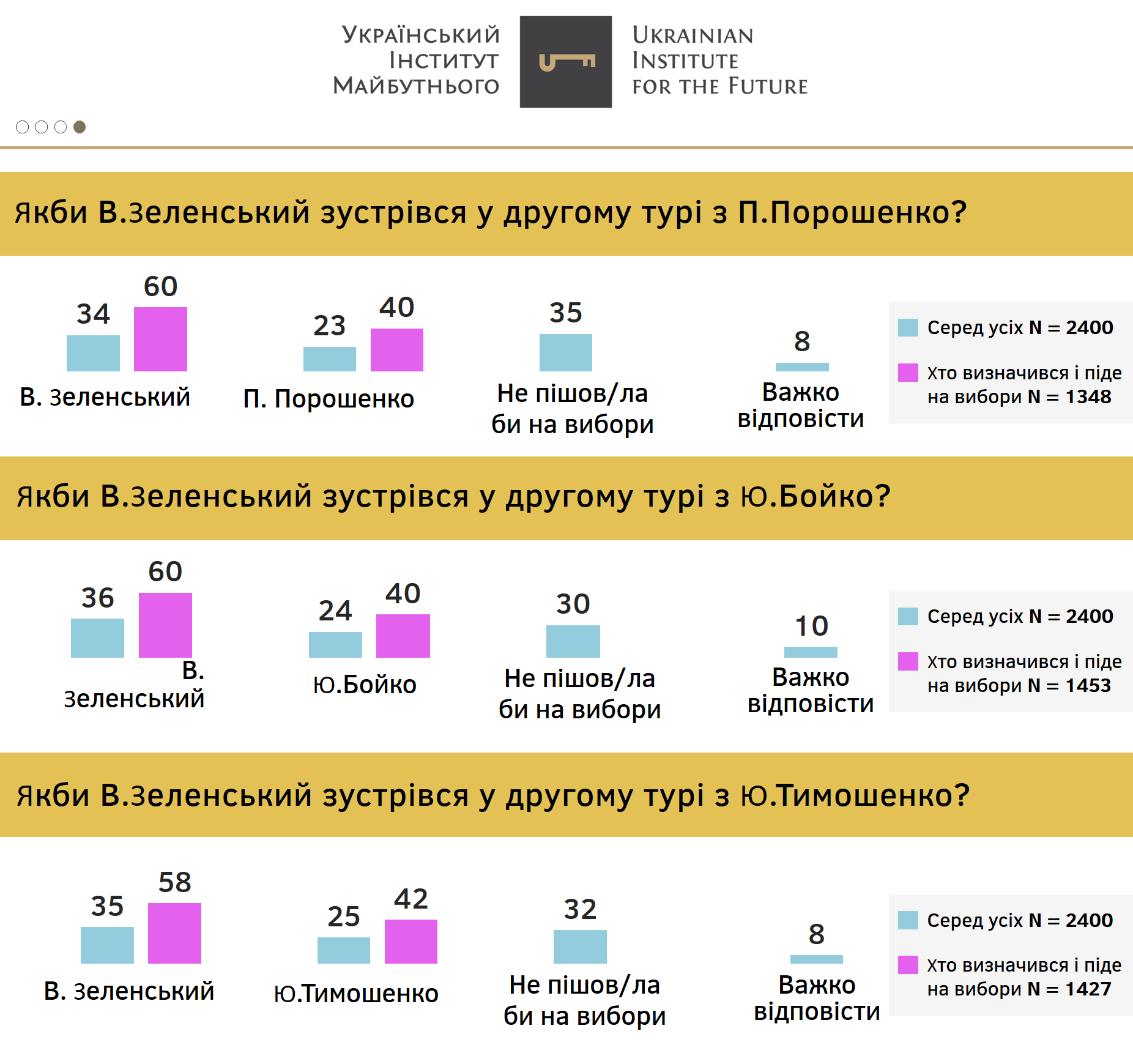 При условии проведения второго тура, Владимир Зеленский безоговорочно выигрывает у всех своих ближайших преследователей почти с идентичными показателями: 36% к 23% против П. Порошенко (60% к 40% среди ушедших и определившихся), 36% к 24% против Ю. Бойко (соответственно 60% к 40%) и 35% к 25% против Тимошенко (соответственно 58% к 42%).