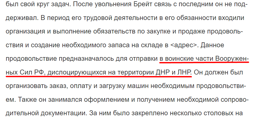 "Данное продовольствие предназначалось для отправки в воинские части Вооружен-ных Сил РФ, дислоцирующихся на территории ДНР и ЛНР", - цитируются в тексте приговора показания подсудимого.
