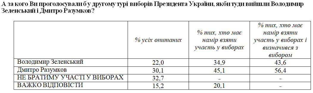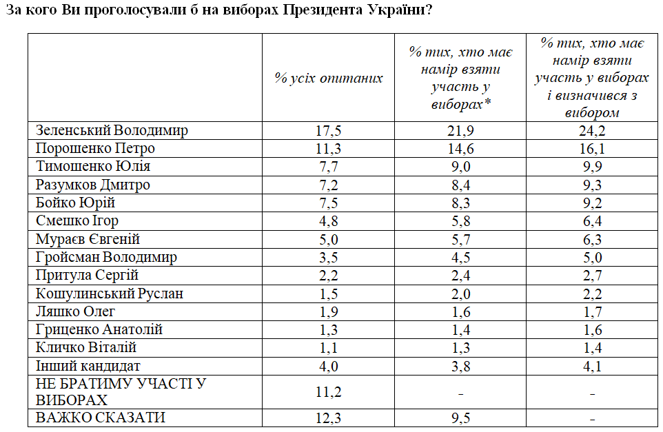 Если бы в ближайшее время проходили президентские выборы, больше всего голосов в первом туре получил бы В. Зеленский (17,5% всех опрошенных или 24% тех, кто примет участие в выборах и определился, за кого будет голосовать). Намерены проголосовать за П. Порошенко соответственно 11% и 16% опрошенных, за Ю. Тимошенко – соответственно 8% и 10%, за Ю. Бойко – соответственно 7,5% и 9%, за Д. Разумкова – соответственно 7% и 9%, за И. Смешко - соответственно 5% и 6%, за Е. Мураева - соответственно 5% и 6%, за В. Гройсмана - соответственно 3,5% и 5%, за С. Притулу - соответственно 2% и 3%, за О. Ляшко – соответственно 2% и 2%, %, за Р. Кошулинского – соответственно 1,5% и 2%, за А. Гриценко – соответственно 1% и 2%, за В. Кличко – соответственно 1 % и 1%.