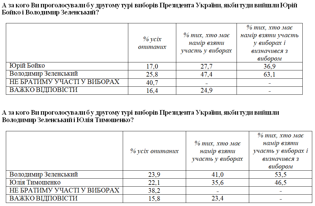 Среди респондентов, которые намерены принять участие в выборах и определились с выбором, проголосовали бы во втором туре за Зеленского – 49,9%, за Порошенко – 50,1%.