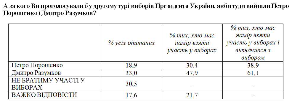 Также результаты опроса свидетельствуют, что Разумков со значительным отрывом выиграл бы у Порошенко.