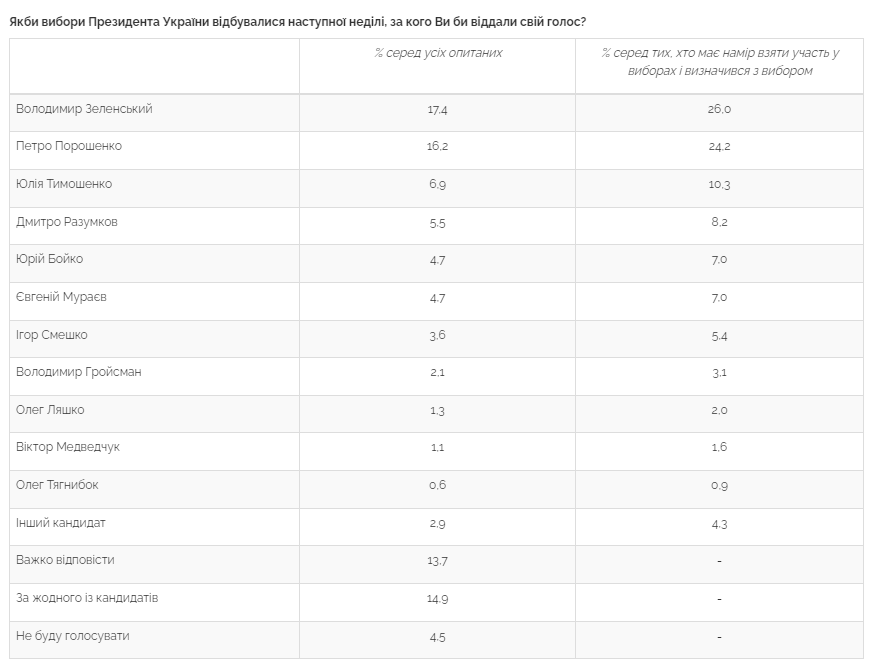 Соцопрос показал, что если бы в ближайшее время проходили президентские выборы, больше всего голосов в первом туре получили бы Владимир Зеленский (17,4% всех опрошенных, или 26,0% тех, кто намерен принять участие в выборах и определился с выбором) и Петр Порошенко (16,2% и 24,2% соответственно).