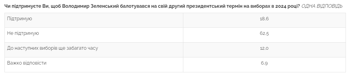 62,5% опрошенных не поддерживают идею, чтобы Владимир Зеленский баллотировался на свой второй президентский срок на выборах в 2024 году. Поддержали бы баллотирование Зеленского на второй президентский срок 18,6% респондентов. Остальные опрошенные не определились с выбором.