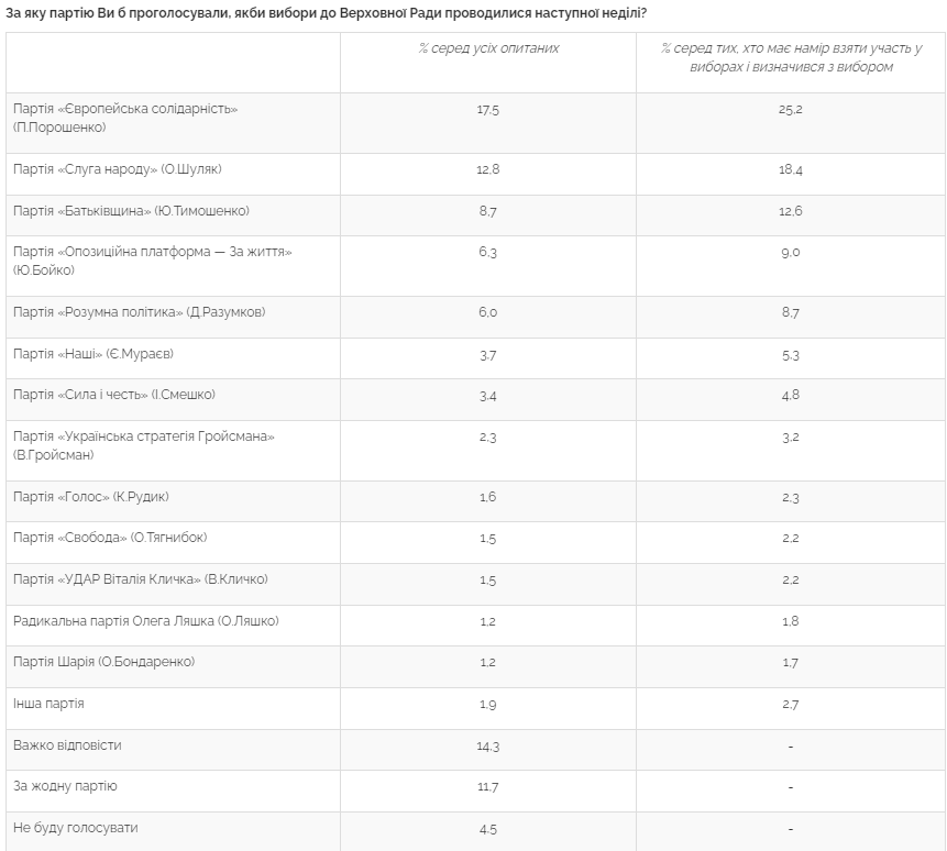 Если бы в ближайшее время проходили выборы в Верховную Раду Украины, наибольшую поддержку избирателей получила бы партия «Европейская Солидарность» (за нее готовы отдать свой голос 17,5% всех опрошенных или 25,2% тех, кто намерен принять участие в выборах и определился с выбором).