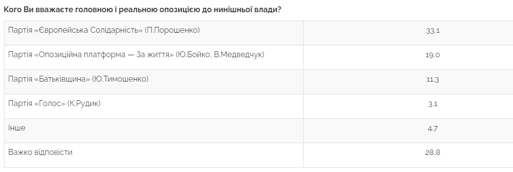 Чаще всего респонденты считают, что главной и реальной оппозицией к нынешней власти является партия «Европейская Солидарность» (такого мнения придерживаются 33,1% опрошенных). 19,0% опрошенных главной и реальной оппозицией к нынешней власти считают партию «Оппозиционная платформа – За жизнь», 11,3% – ВО «Батькивщина».