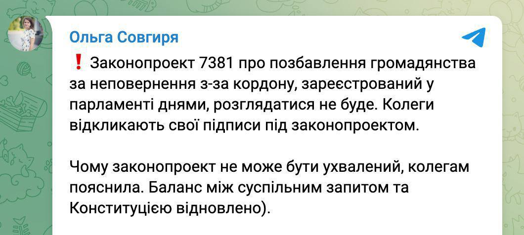 "Законопроект 7381 о лишении гражданства за невозвращение из-за границы, зарегистрированный в парламенте на днях, рассматриваться не будет. Коллеги отзывают свои подписи под законопроектом", - написала Совгиря.
