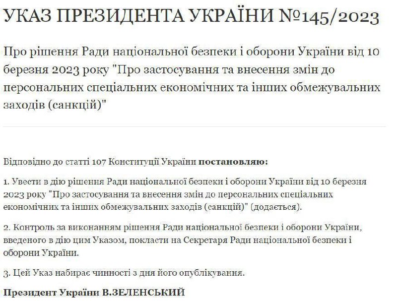 "В соответствии со статьей 107 Конституции Украины постановляю: 1. Ввести в действие решение Совета национальной безопасности и обороны Украины от 10 марта 2023 г. "О применении и внесении изменений в персональные специальные экономические и другие ограничительные меры (санкции)", - говорится в указен Зеленского.