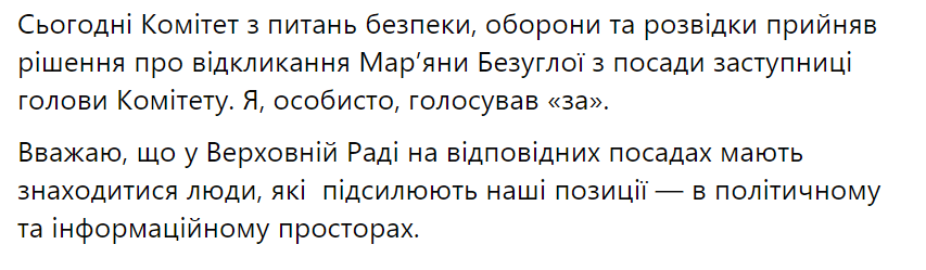 "Госпожа Безуглая не может оставаться на должности заместителя председателя комитета по вопросам национальной безопасности, обороны и разведки. Точка. Зарегистрировал постановление о ее увольнении!", - написал он.