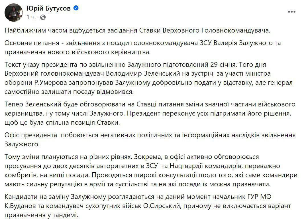 Кроме того, он опубликовал имена кандидатов на замену Залужному – начальник Главного управления разведки Министерства обороны Украины Кирилл Буданов и командующий Сухопутными войсками Александр Сырский. Более того, он не исключил вариант назначения "в тандеме".