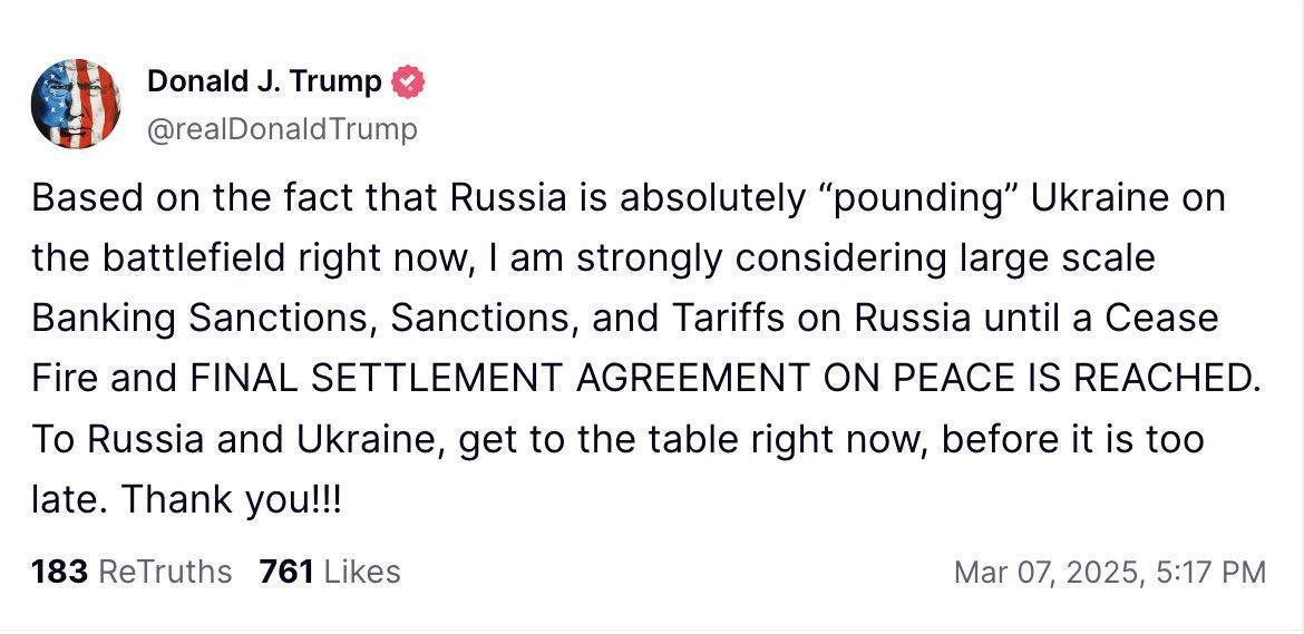 В своем сообщении Трамп подчеркнул, что Россия "давит" на Украину, а значит, он рассматривает возможность введения масштабных банковских санкций, экономических ограничений и тарифов. По его мнению, эти меры должны действовать, пока не будет достигнуто прекращение огня и мирного соглашения.