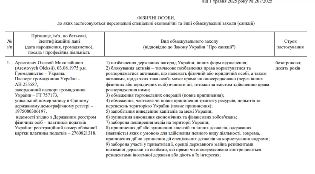 1 мая 2025 года президент ввел в действие три указа Совета национальной безопасности и обороны Украины (№267/2025, №268/2025, №269/2025), касающихся применения персональных санкций против физических и юридических лиц.