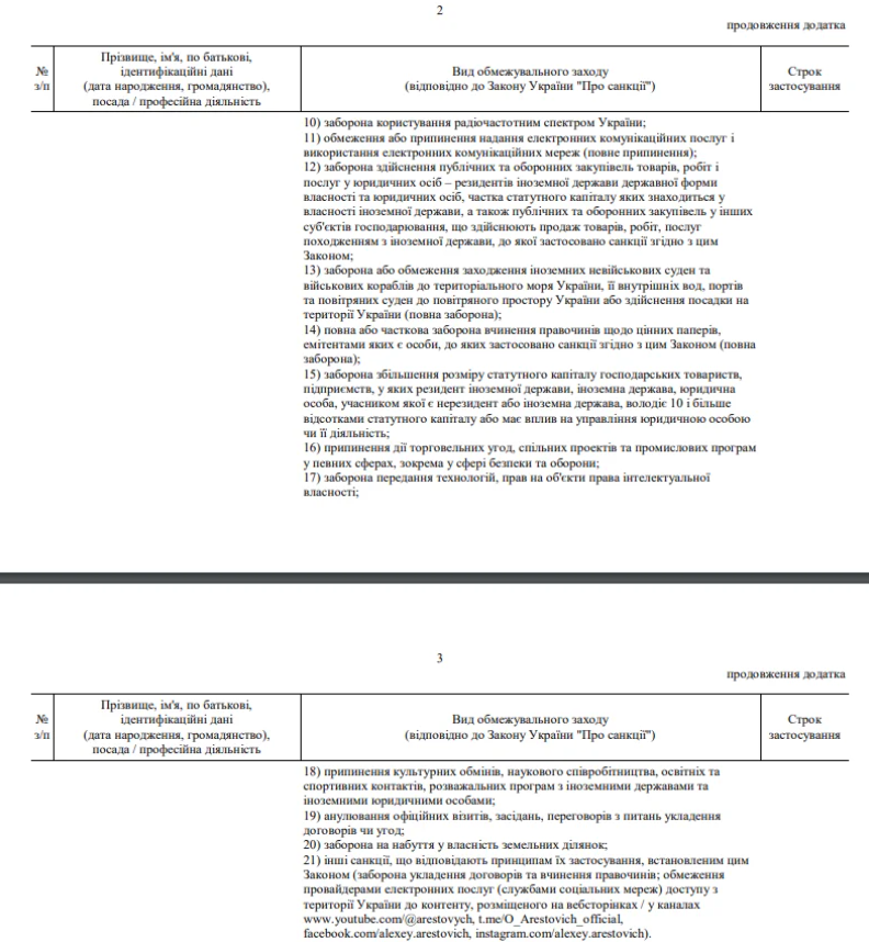 Санкции предусматривают блокировку активов, ограничения торговых операций, аннулирование госнаград Украины и другие меры. В некоторых случаях они вводятся бессрочно или сроком на 10 лет.