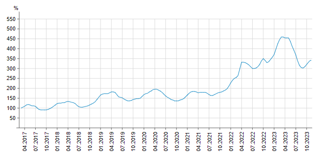 - Индекса цен на рыбу и морепродукты с марта 2017 по ноябрь 2023 вырос на 180%, то есть в 1,8 раза.