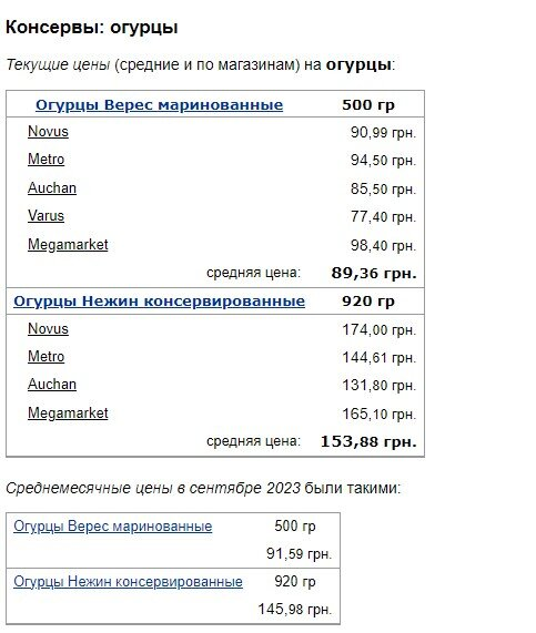 - Консервированные огурцы фирмы “Нежин” – с 145,98 грн до 153,88 грн за баночку 920 грамм.