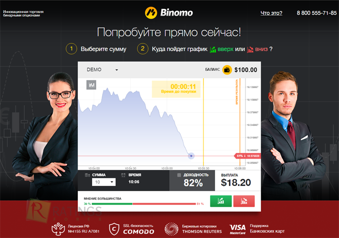 Основанная в 2014 году, компания Биномо сегодня является довольно известным и отлично зарекомендовавшим себя терминалом. Биномо официально зарегистрирован в Великобритании, имеет лицензию и сертификат ЦРОФР. Несмотря на молодой возраст, имеет славу динамично развивающегося оператора финансовых услуг. Это функциональный, удобный, простой в изучении терминал. Своим клиентам компания предлагает услуги высокого качества, много сервисов (на современной платформе размещены семьдесят активов) и лояльные условия торгов.