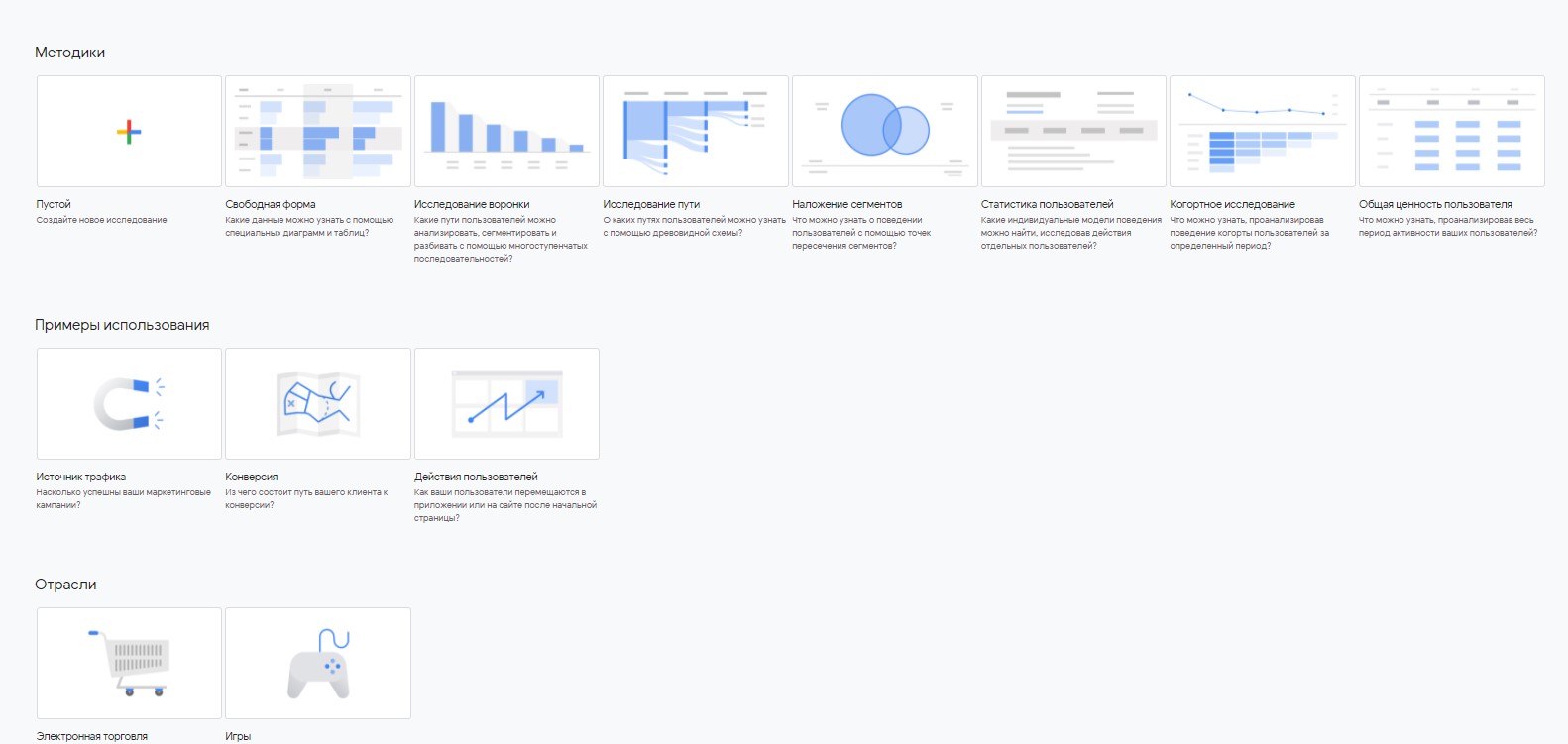 В GA4 у вас есть доступ к отчетам и шаблонам, которые ранее были доступны только для платной версии Google Analytics 360. Перейдя в центр аналитики, вы можете начать новый анализ на основе интересующего вас шаблона.