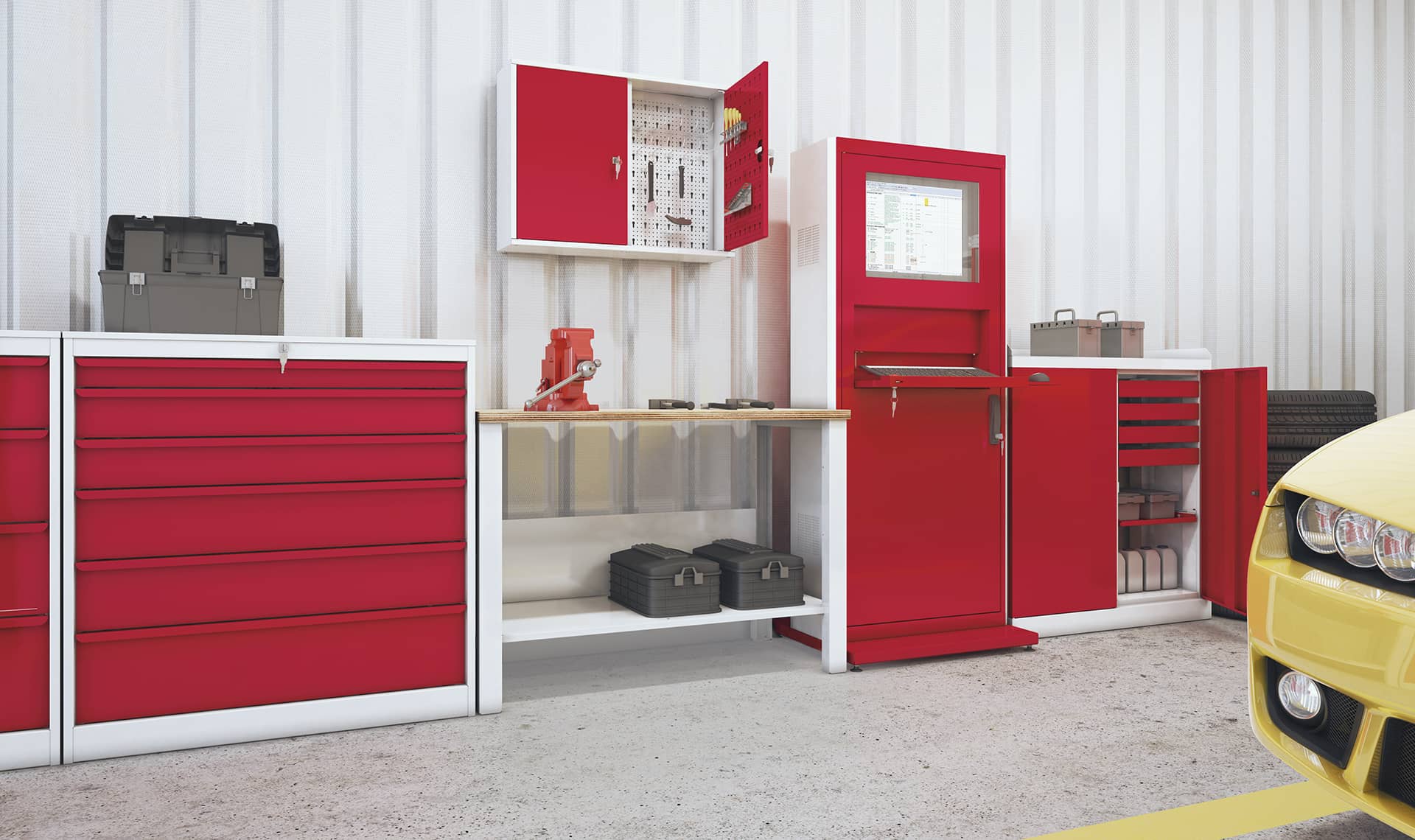 - Инструментальные шкафы с усиленными полками для хранения тяжелого оборудования и инструментов.