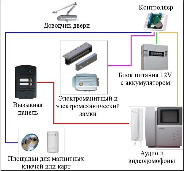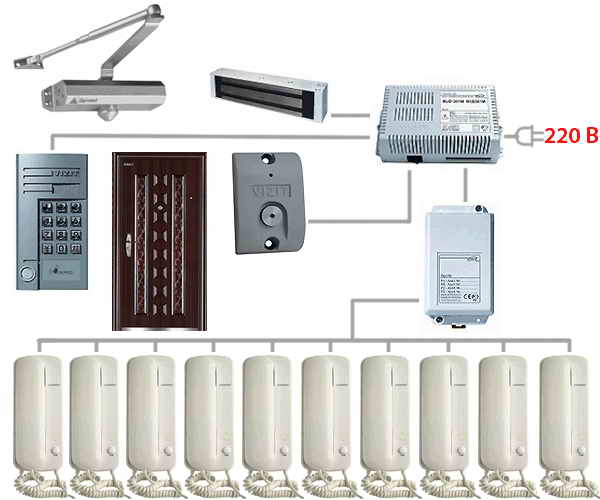 На первом этаже в металлической двери с магнитным замком устанавливают вызывную панель с цифровой клавиатурой, микрофоном и динамиком (видеокамерой), также там предусмотрено наличие считывателя электронных ключей. В каждой квартире устанавливается вызывная трубка с возможностью двусторонней аудиосвязи (или видеосвязи) и с кнопкой для возможности удаленного отпирания замка двери подъезда . Электронные ключи (как правило в виде небольших брелков) выдаются всем жильцам подъезда; приложив ключ к считывателю, контроллер открывает замок и владелец ключа может открыть дверь и беспрепятственно зайти внутрь. С обратной стороны входной двери устанавливается специальная кнопка, нажав которую замок также откроется: то есть чтобы выйти из подъезда, ключ не нужен.
