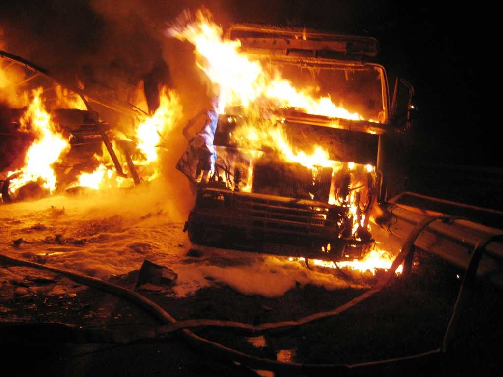 В результате пожара огнем уничтожен автомобиль «Вольво», полуприцеп, с алкогольными напитками, тент полуприцепа автомобиля «Скания». Огнем повреждена кабина автомобиля «Скания», ОСП-плиту. Убытки от происшествия устанавливаются. Пострадавших и погибших в результате происшествия нет.