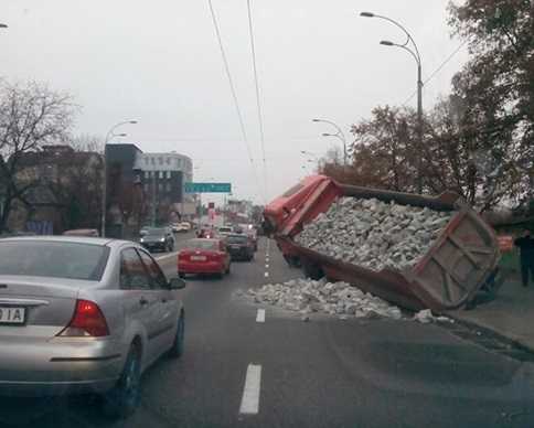 В среду днем в Киеве на Краснозвездном проспекте на бок перевернулся грузовик с камнями. Часть камней вывалилась на дорогу.