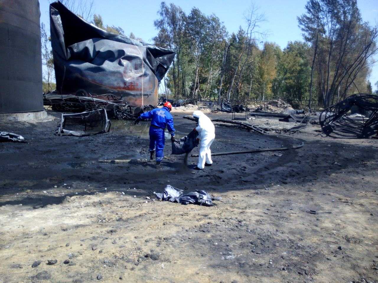 В течение суток работниками нефтебазы БРСМ завершена перекачка нефтепродуктов из поврежденных резервуаров до уцелевших емкостей (3 емкости по 900 куб.м и 3 емкости по 50 куб.м.), а также проведены слесарные работы по предотвращению капельного подтекания нефтепродуктов из емкостей в которые осуществлены перекачки остатков топлива.