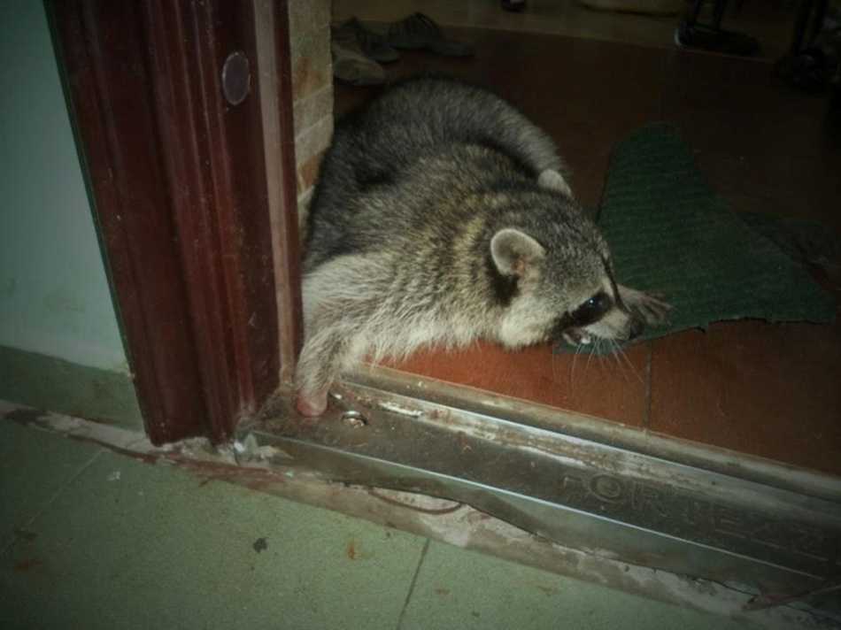 В результате длительного пребывания в металлической ловушке, лапка енота была сильно повреждена, поэтому спасатели передали енота ветеринарам Броварского района.