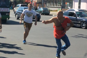 Наряд милиции так и не смог задержать «фаната совка» - после того, как мужчине разорвали футболку, он скрылся с места происшествия.