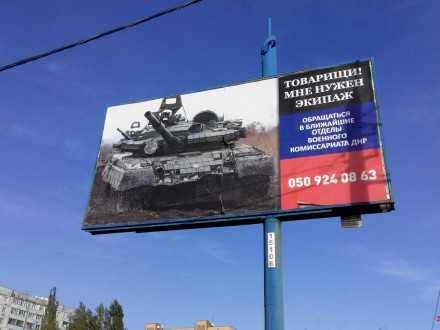 "Товарищ! Мне нужен экипаж! Обращаться в ближайшие отделы военного комиссариата "ДНР", - говорится в надписи на билборде.