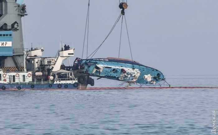 Поднятый на поверхность затонувший катер «Иволга» в Затоке на плавкране транспортировали в Ильичевск. Здесь должны достать тела двух человек, обнаруженных вчера при подъеме судна.