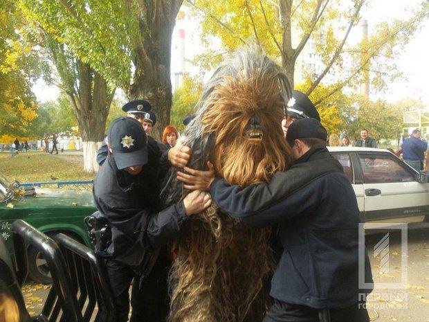 В Одессе полиция задержала человека в костюме персонажа из фильма "Звездные войны" Чубакки и увезла в райотдел.