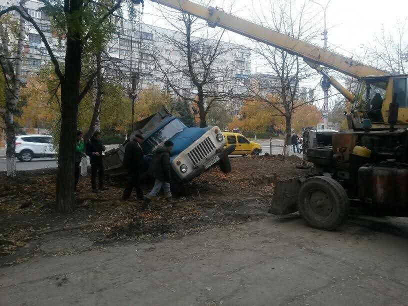 Сегодня в Мариуполе недалеко от перекрестка проспекта Ленина и улицы Зелинского грузовик провалился под землю правым задним колесом.