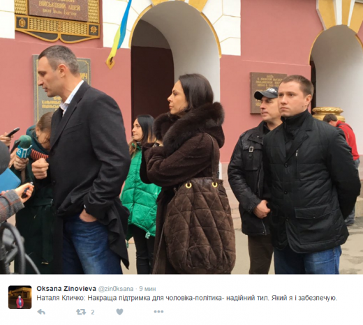 Одна за девушек внезапно сбросила с себя верхнюю одежду, оставшись в одних шортах, грудь у нее были разрисованы. В руках у девушки был плакат с надписью «Стоп сутенер», эти же слова она выкрикивала в адрес Кличко.