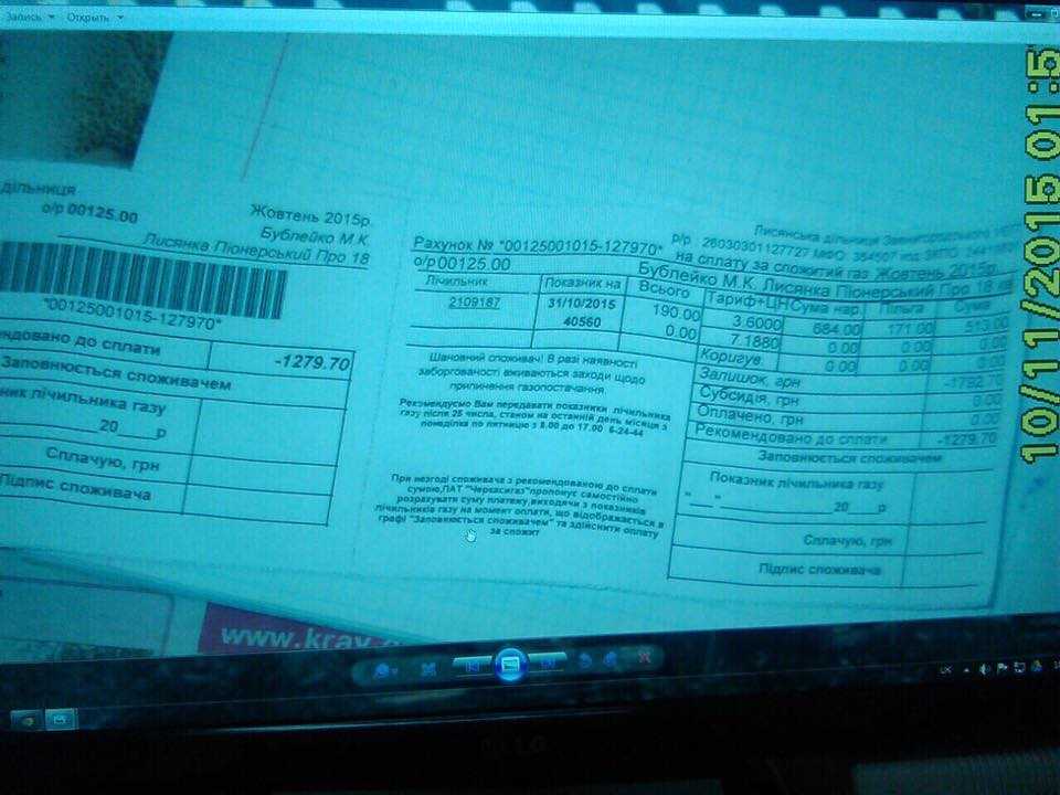 В подтверждении моих слов и во избежание спекуляций "о счёте за газ в 4 тысячи гривен" публикую счёт, который получила Мария Кириловна за октябрь 2015 года.