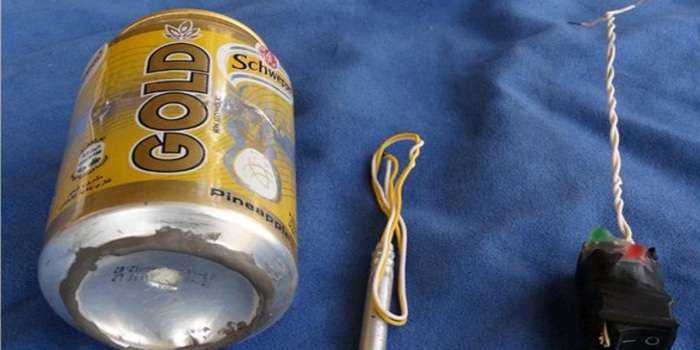 Самодельное взрывное устройство представляет собой жестяную банку из-под напитка Schweppes и взрывной механизм, в виде провода, присоединенного к металлическому стержню.