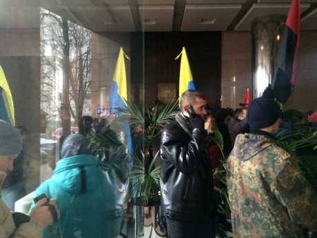 Участники Вече на Майдане после завершения основной части мероприятия в центре города зашли на ул. Десятинную в здание, где находится офис холдинга "СКМ", подконтрольного олигарху Ринату Ахметову.