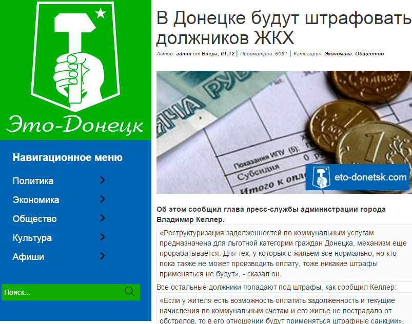 "Если у жителя есть возможность оплатить задолженность и текущие начисления по коммунальным счетам и его жилье не пострадало от обстрелов, то в его отношении будут применяться штрафные санкции", - констатировал глава пресс-службы так называемой "городской администрации" Донецка Владимир Келлер.