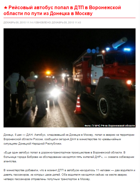 Сегодня, 8 декабря, автобус сообщением Донецк-Москва попал в дорожно-транспортное происшествие на территории Воронежской области России.