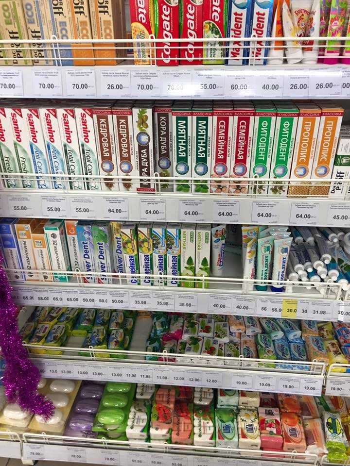На фотографии цены в рублях, например колбасы от 200 руб. до 600 руб.; молоко 40-50 руб.; зубная паста 55 руб.- 70 руб.; шампуни от 250 руб. В торговом центре «Сити-Центр» женская блузка стоит от 800-900 руб.; сумки от 3 тыс. руб.
