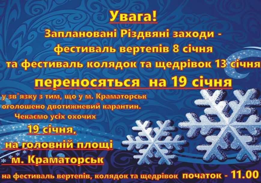В связи с объявлением в Краматорске карантина из-за эпидемии гриппа переносятся Рождественские мероприятия: конкурс вертепов, который планировали проводить 8 января, и фестиваль колядок и щедривок, запланированный на 13 января.