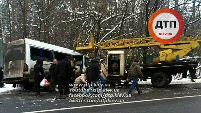 В среду, 6 января, в столице Украины произошло ужасное дорожно-транспортное происшествие – маршрутное такси столкнулось с автомобильной вышкой. Пятнадцать пассажиров госпитализированы.