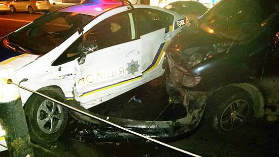 На этот раз, 10.02.2016 около 23:45, на ул.Щербакова, полицейские, находясь в правом ряду, начал разворот через двойную сплошную к Нивкам. Во время маневра в его левую сторону врезался Мерседес Вито. Как сообщает dtp.kiev.ua, от сильного удара оба авто выбросило во встречный правый ряд, где Приус уперся в бордюр.