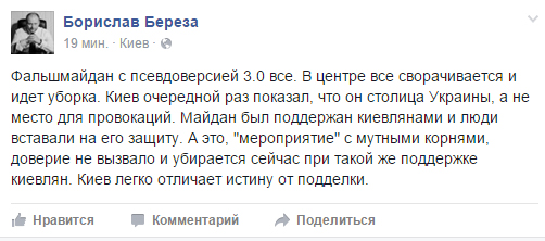 "Майдан был поддержан киевлянами и люди вставали на его защиту. А это, "мероприятие" с мутными корнями, доверие не вызвало и убирается сейчас при такой же поддержке киевлян", - прокомментировал политик.