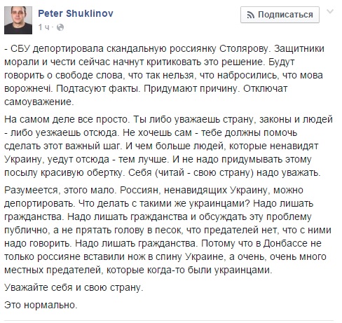 Известный журналист Петр Шуклинов задается вопросом: Что делать с украинцами, которые ненавидят Украину? Если россиян можно депортировать – то предателей среди украинцев нужно, как минимум, лишать гражданства.