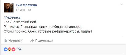 "Авдеевка. Крайне жёсткий бой. Рашистский спецназ, танки, тяжёлая артиллерия. Стоим прочно. Орки, готовьте рефрижераторы...", - написал Златкин.