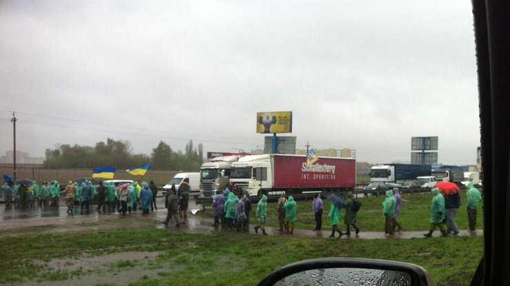 В Киеве на Окружной дороге группа неизвестных людей заблокировала трассу. Митингующие называют себя участниками АТО.