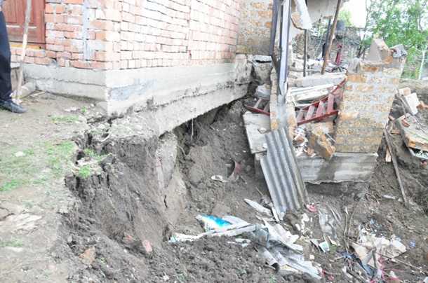 Котлован уже вокруг места прорыва немалый, частично просела земля под фундаментом одной из стен. На месте происшествия работает техника и люди, обещают дом спасти.