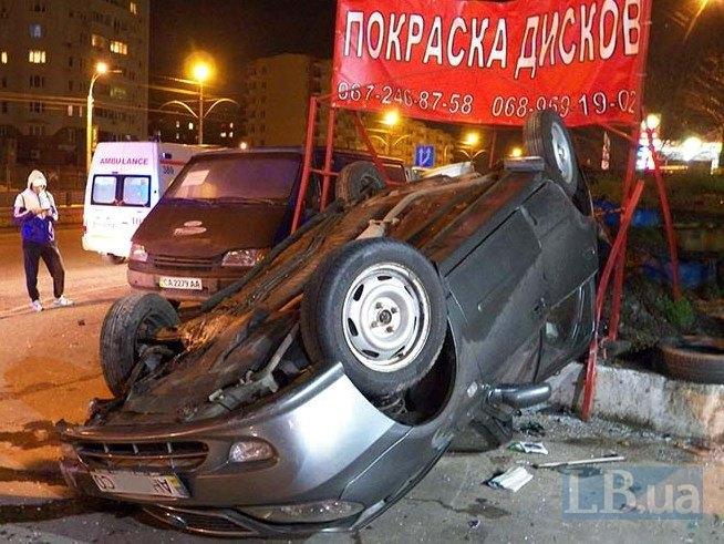 В Киеве в пятницу, 15 апреля, поздно вечером на проспекте Комарова автомобиль "Geely" протаранил "ВАЗ-2106", влетел в шиномонтаж и перевернулся на крышу.