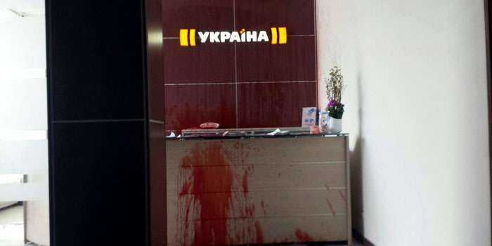 Люди, которые назвали себя "активистами фронта борьбы против оккупации", облили красной жидкостью приемную телеканала "Украина" бизнесмена Рината Ахметова.