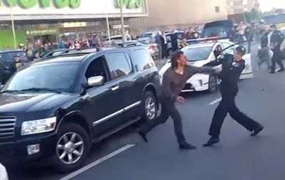 В Киеве водитель джипа на глазах у толпы устроил драку с сотрудниками патрульной полиции. Для укрощения дебошира полицейские пустили в ход спецсредства.